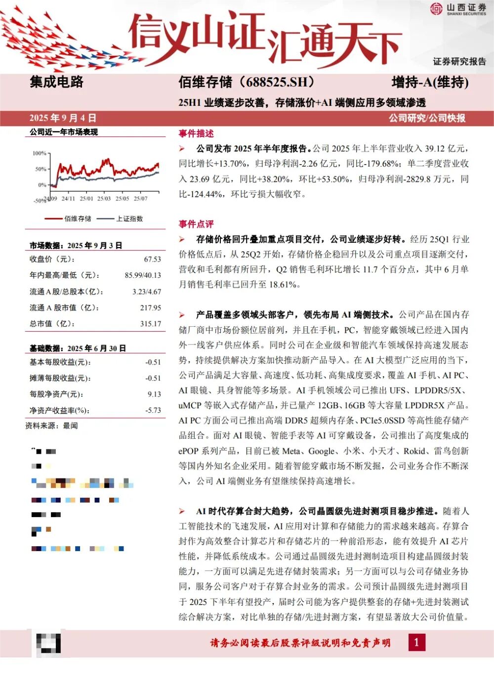 公司是国内领先的半导体存储器产品供应商,2025年前三季度营收65.75亿元,同比增长30.84%,业绩持续改善主要得益于存储价格回升及AI端侧产品需求放量。
